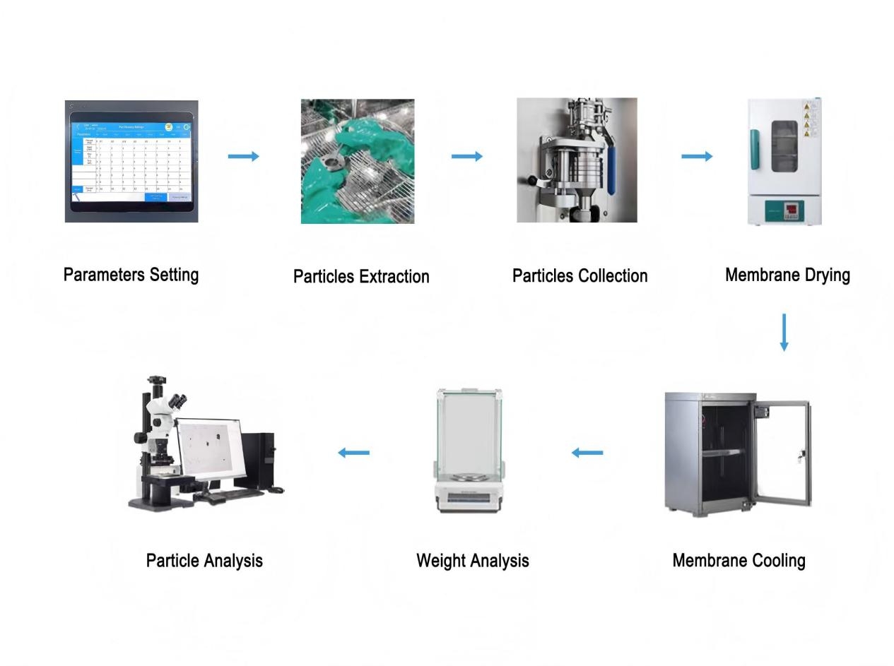 -Wet extraction: Using a specified liquid medium, flushing the surface of components with a standard nozzle within a set pressure range to separate solid particles from the components, which are then collected on the detection filter membrane.
